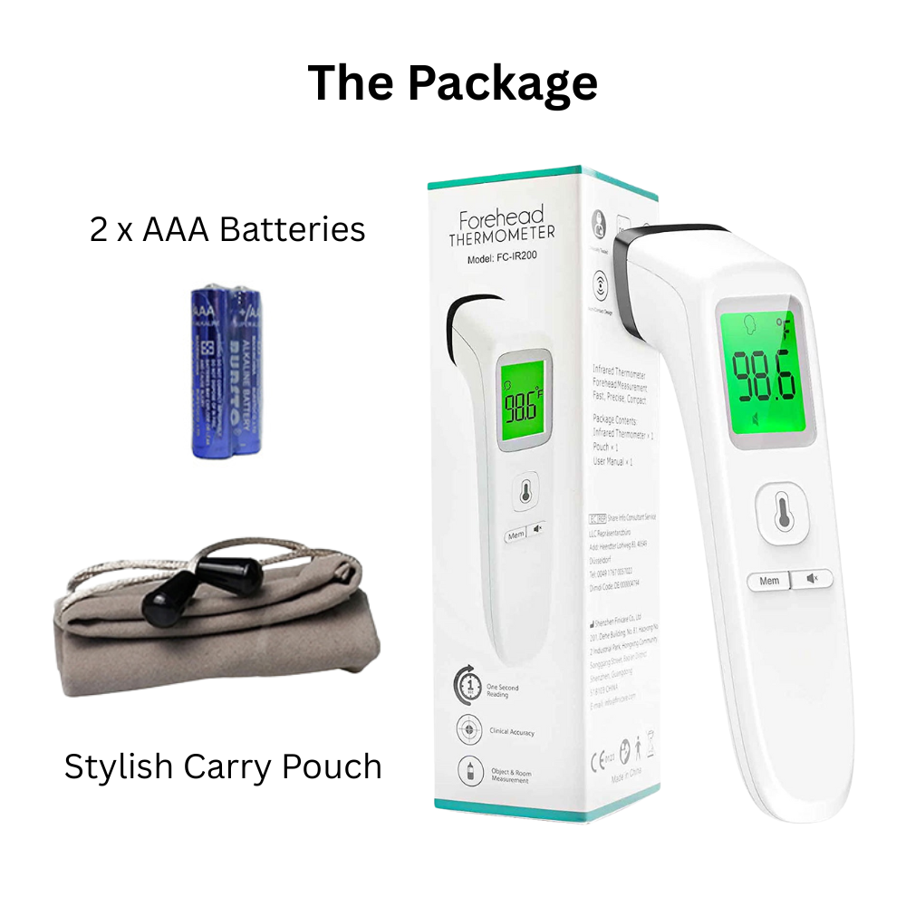 The thermometer measures body temperature without making contact with the skin, which reduces the risk of infection and makes it more hygienic to use. It can also be used to measure the temperature of objects and surfaces