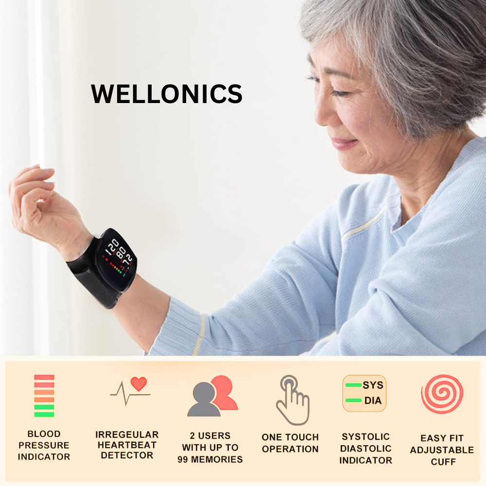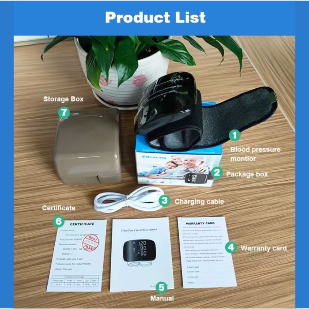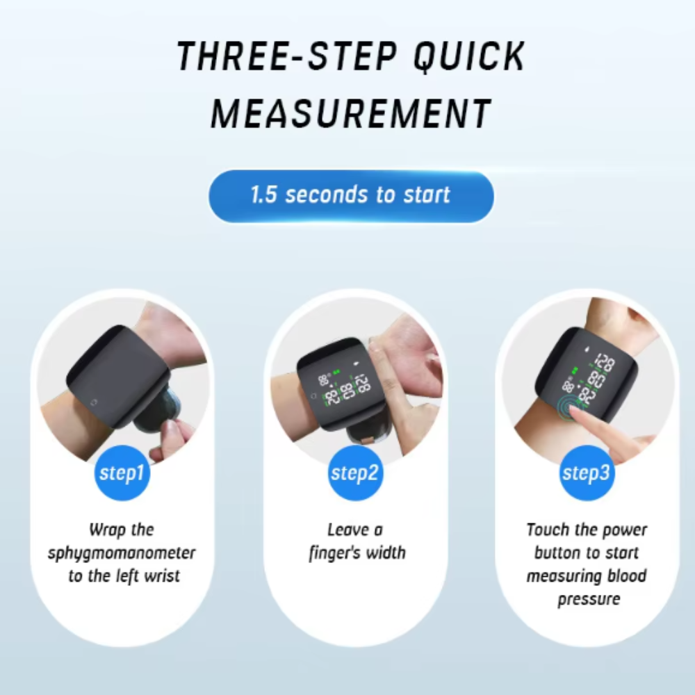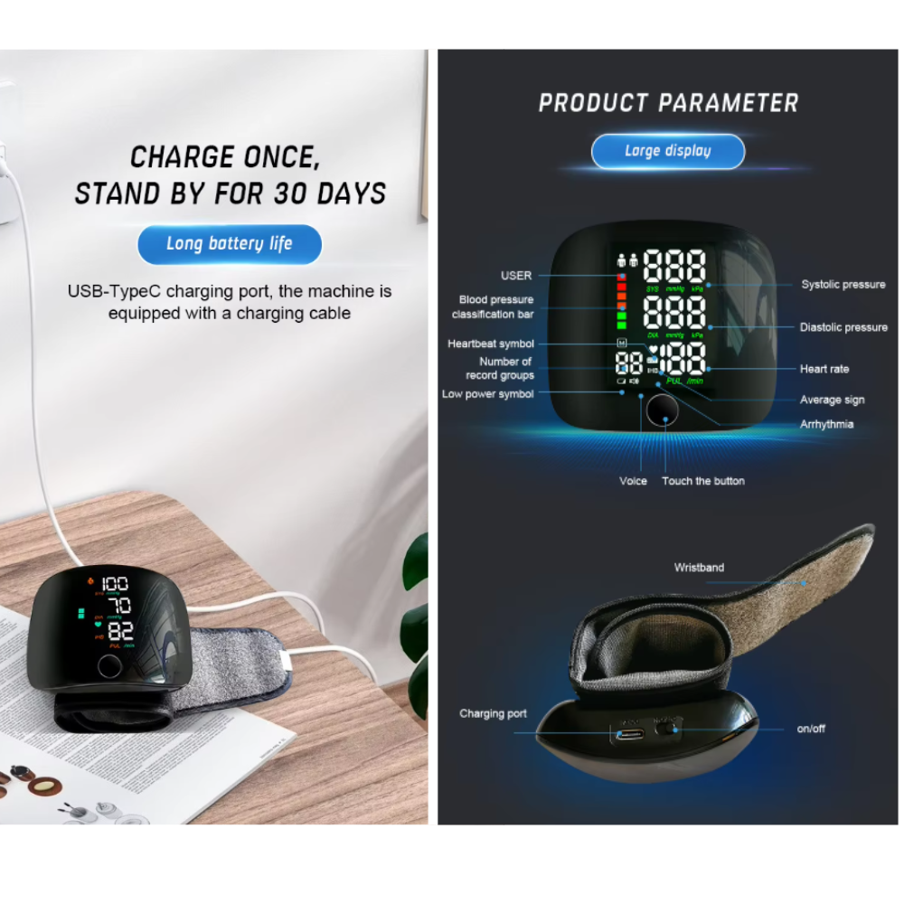 Wrist blood pressure monitor with a large LED screen and touch screen buttons, clear readings, and people with impaired vision can quickly view the results. Three-color display LED screen, different blood pressure data show different colours, you can know whether the blood pressure is in the normal range or not